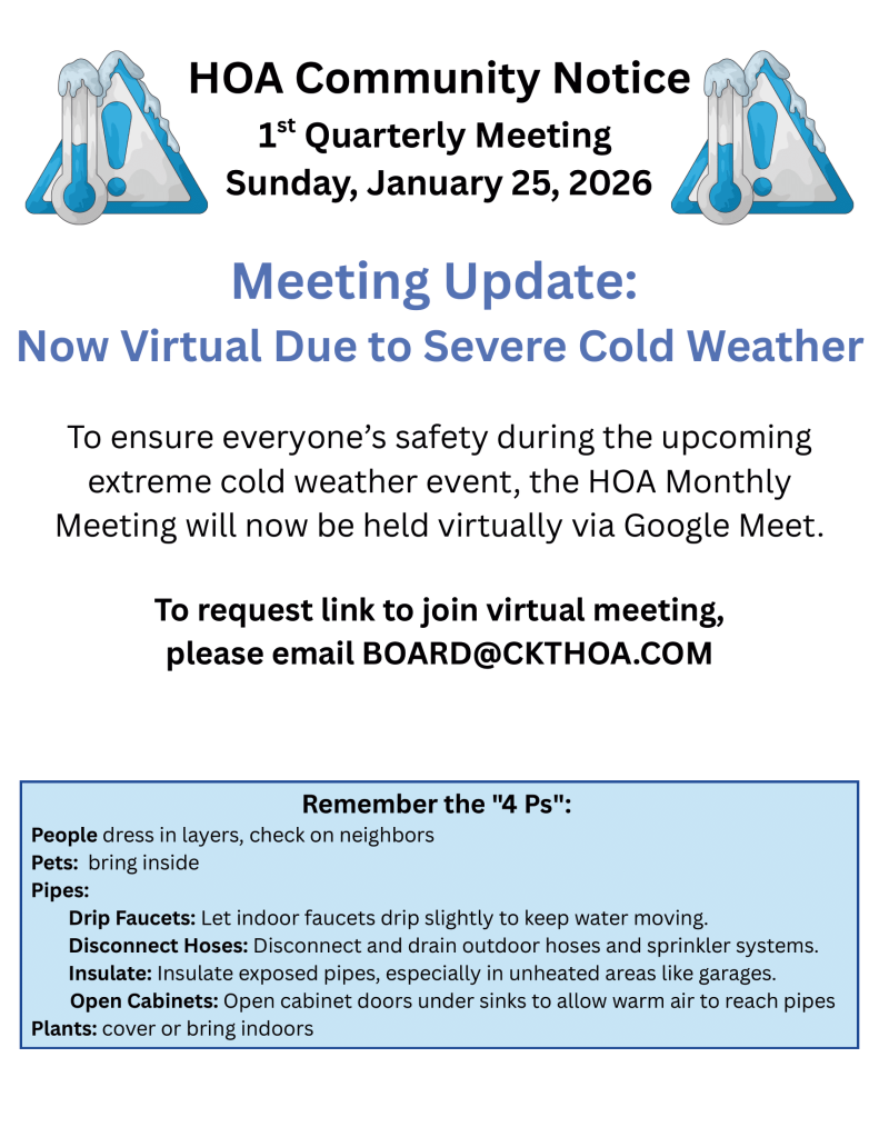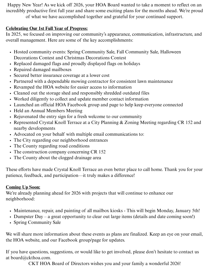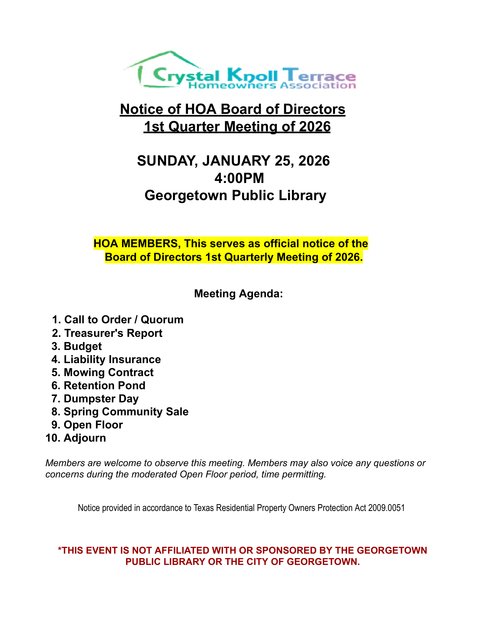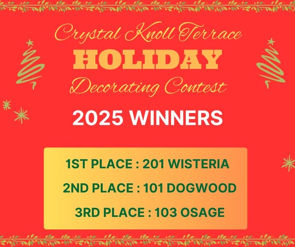 Crystal Knoll Terrace Homeowners Association Quick Links Resale Certificate Requests New Member Registration Member Contact Info Update Join our Official Homeowners’ Facebook Group (Homeowners Only) News & Announcements View Last Meeting Information Here Need more information? Contact Us