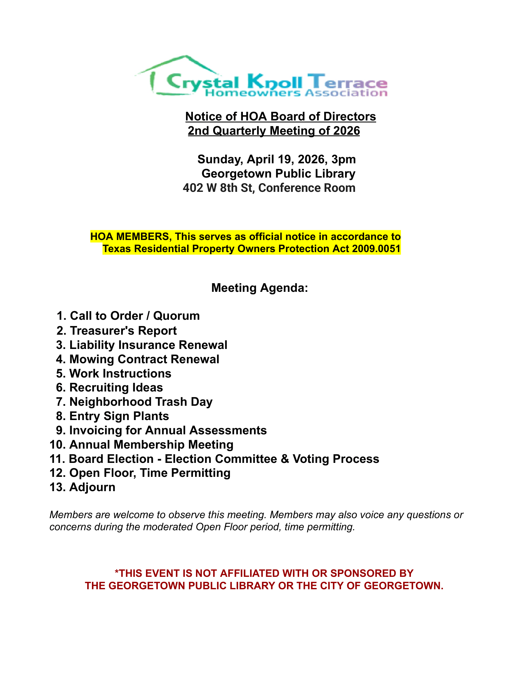 Crystal Knoll Terrace Homeowners Association Quick Links Resale Certificate Requests New Member Registration Member Contact Info Update News & Announcements Join our Official Homeowners’ Facebook Group (Homeowners Only) Need more information? Contact Us