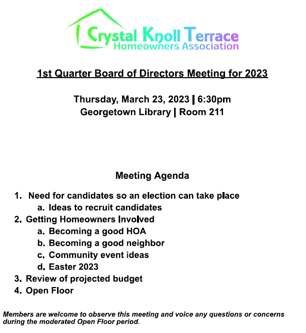 Hello neighbors! The Crystal Knoll Terrace HOA has scheduled our 1Q 2023 meeting. Members are welcome to observe this meeting and voice any questions or concerns during the moderated Open Floor period.