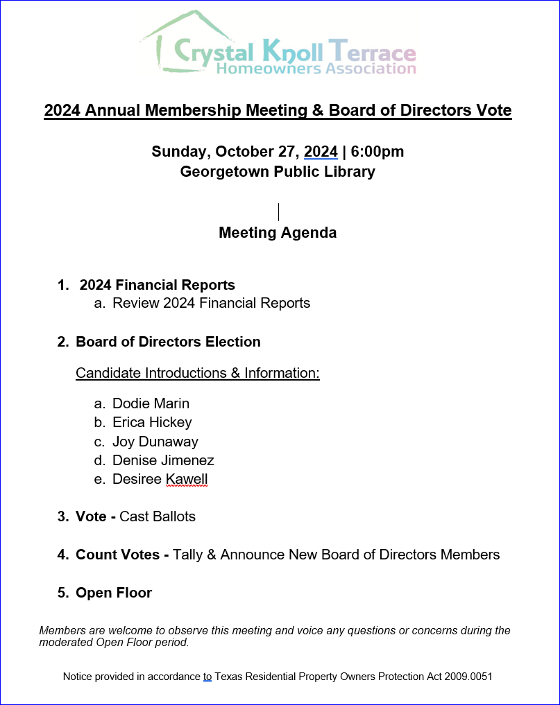 2024 Annual Membership Meeting & Board of Directors Vote – Only PAPER BALLOTS will be used to vote this election Posted byCKT HOASeptember 15, 2024September 15, 2024Posted inUncategorized Related