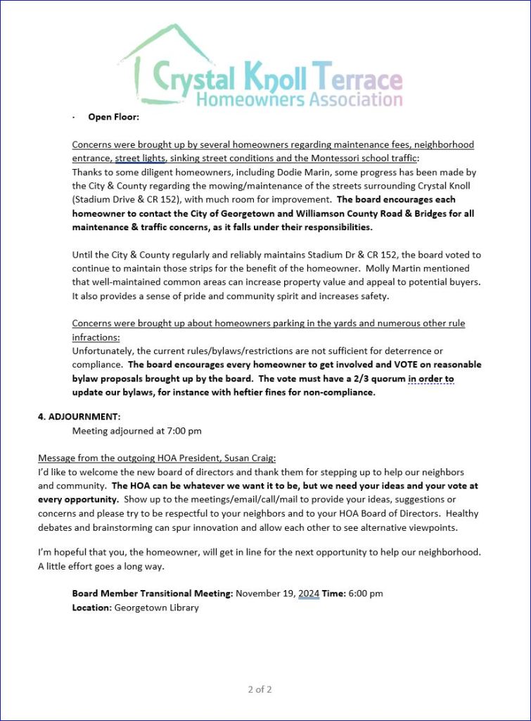 2024 Annual Membership Meeting & Board of Directors Vote – MINUTES Posted byCKT HOANovember 8, 2024Posted inUncategorized Related